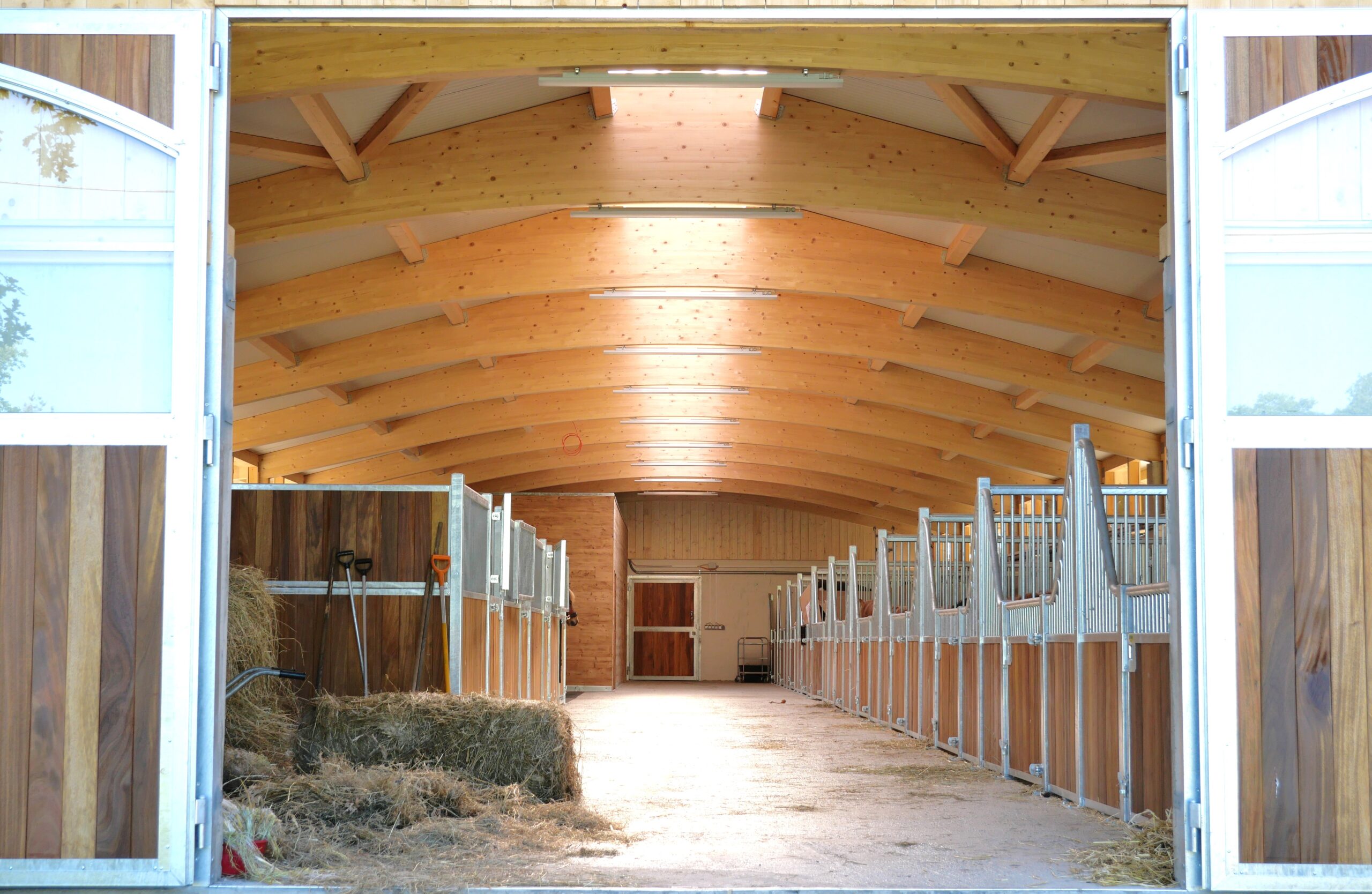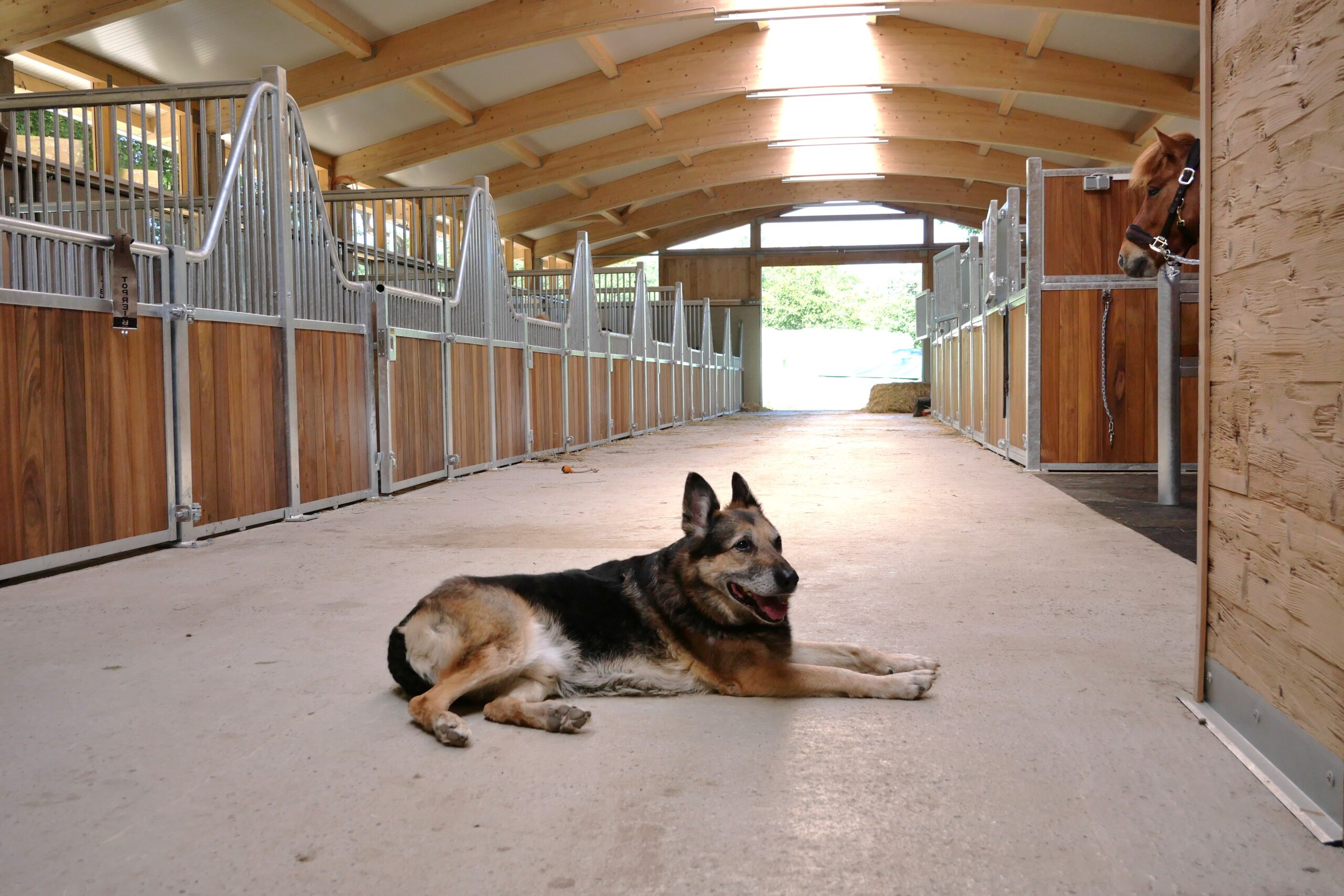 Unser 2019 fertiggestellter Hengst- und Berittstall bietet viel Licht eine sehr gute Belüftung, geräumige Boxen mit niedrigen Frontwänden und Außenpaddocks an fast allen Boxen. Bei einigen Boxen wurde mit Niedrigen Zwischenwänden gearbeitet, um bestmögliche Sozialkontakte zu ermöglichen.
